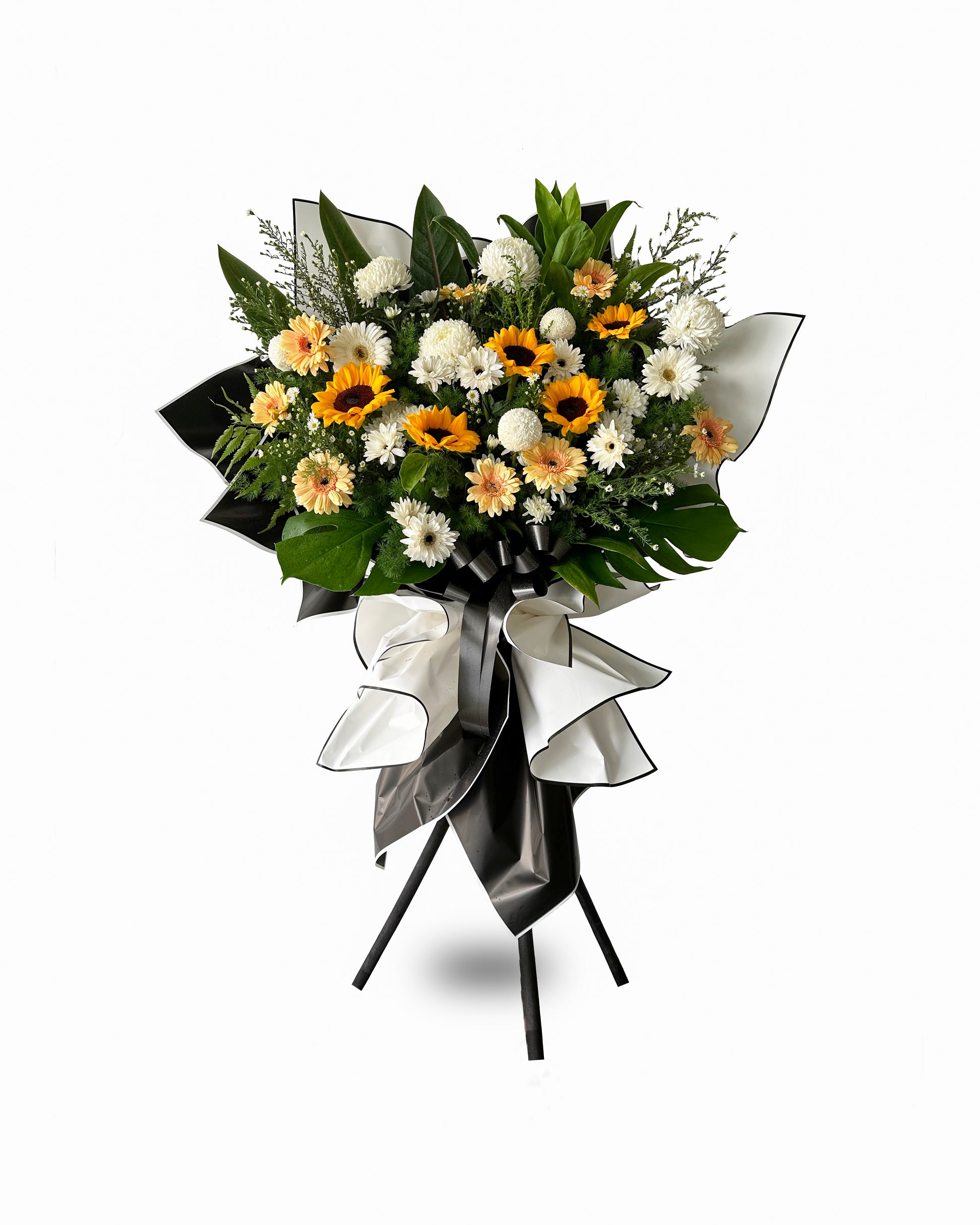 - This Condolences Stands features Sunflowers, Chrysanthemums Taiwan Mum, Ping Pong, Gerbera, Chrysanthemums Pom Pom, with a touch of, Snow White leaves, Rainforest Leave, Monstera leaves & Peacocks .