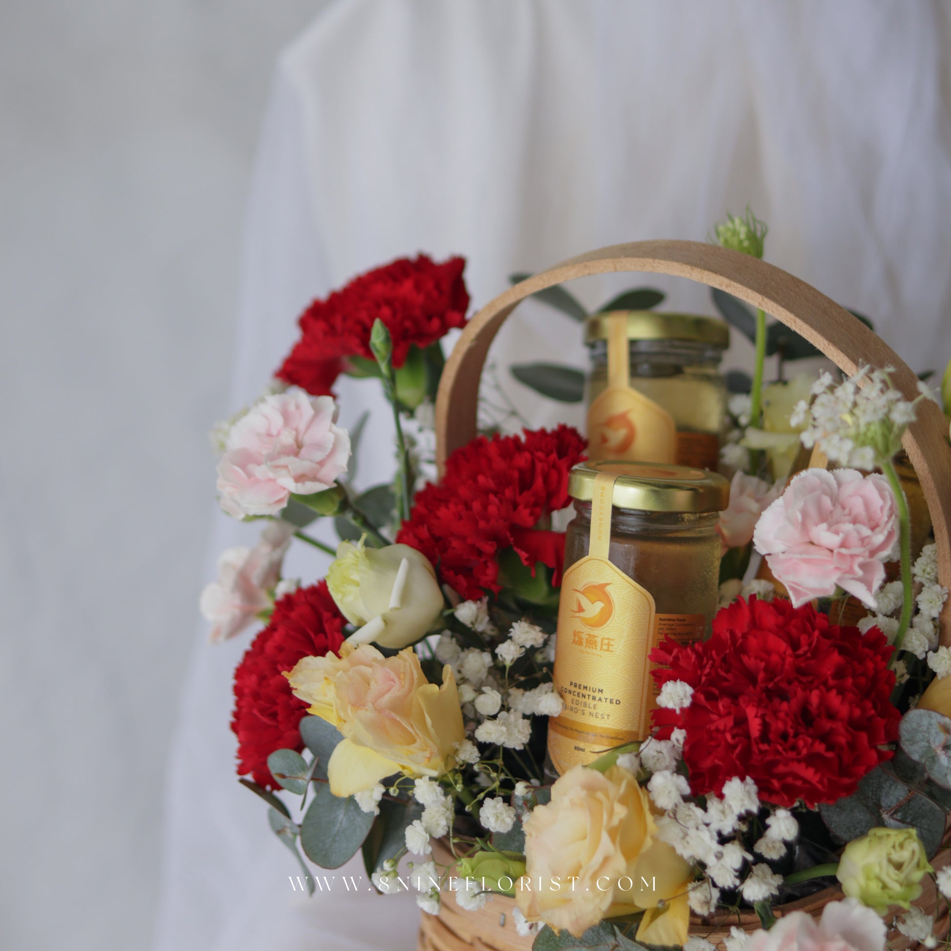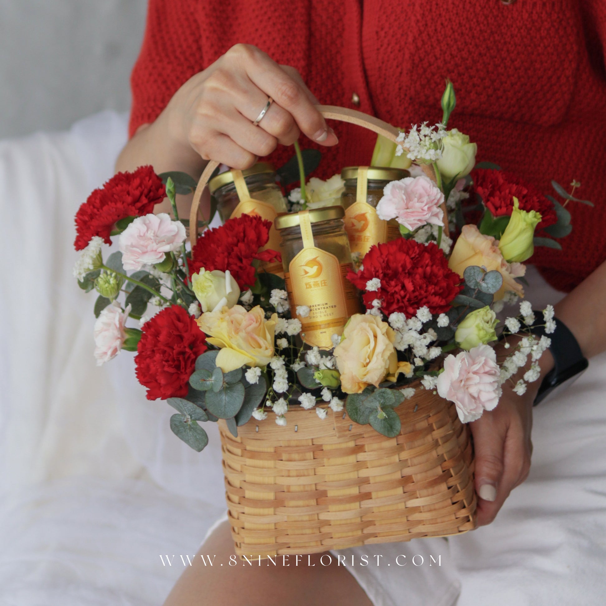 - This flower basket features three bottles of Bird Nest, Red Carnations, Eustomas, Spray Carnations, Baby breath, Lace Flowers, and Eucalyptus.