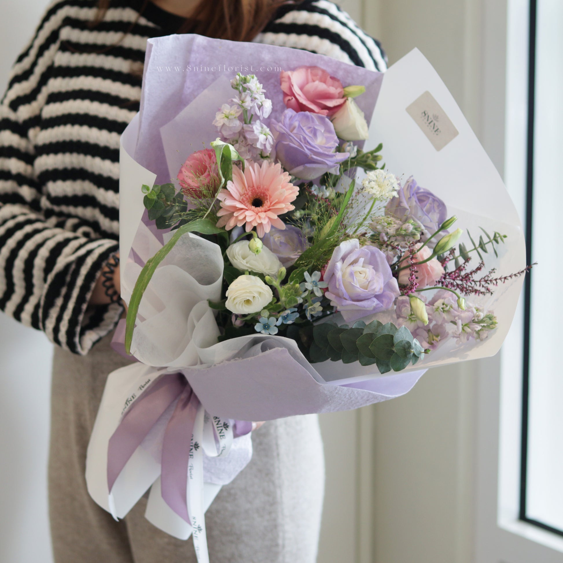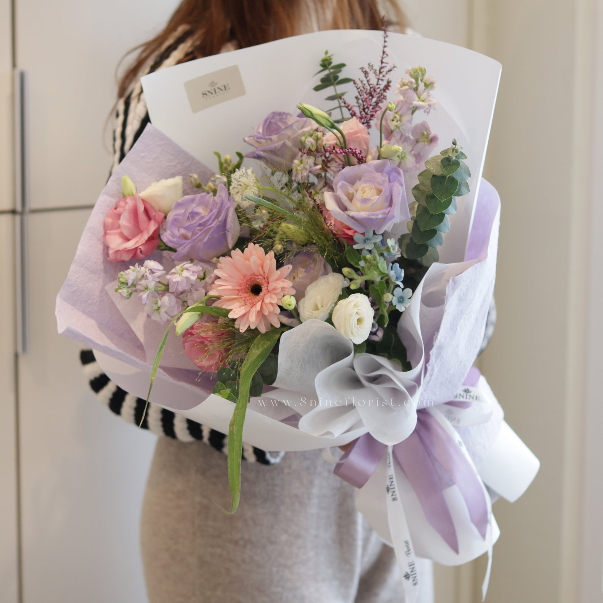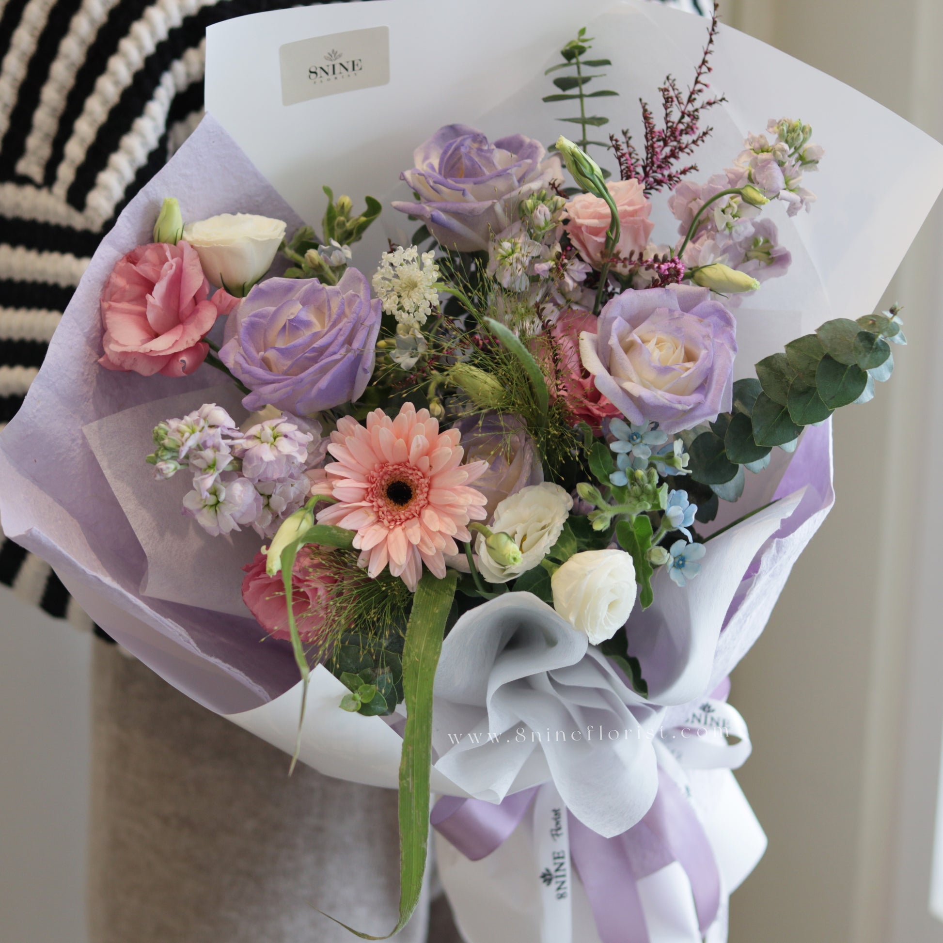- This mixed flowers bouquet features Roses, Gerbera, Eustoma, Matthiola, Snow Plum, Panicum, Lace Flower, Baby Blue with a touch of Eucalyptus Leaves.