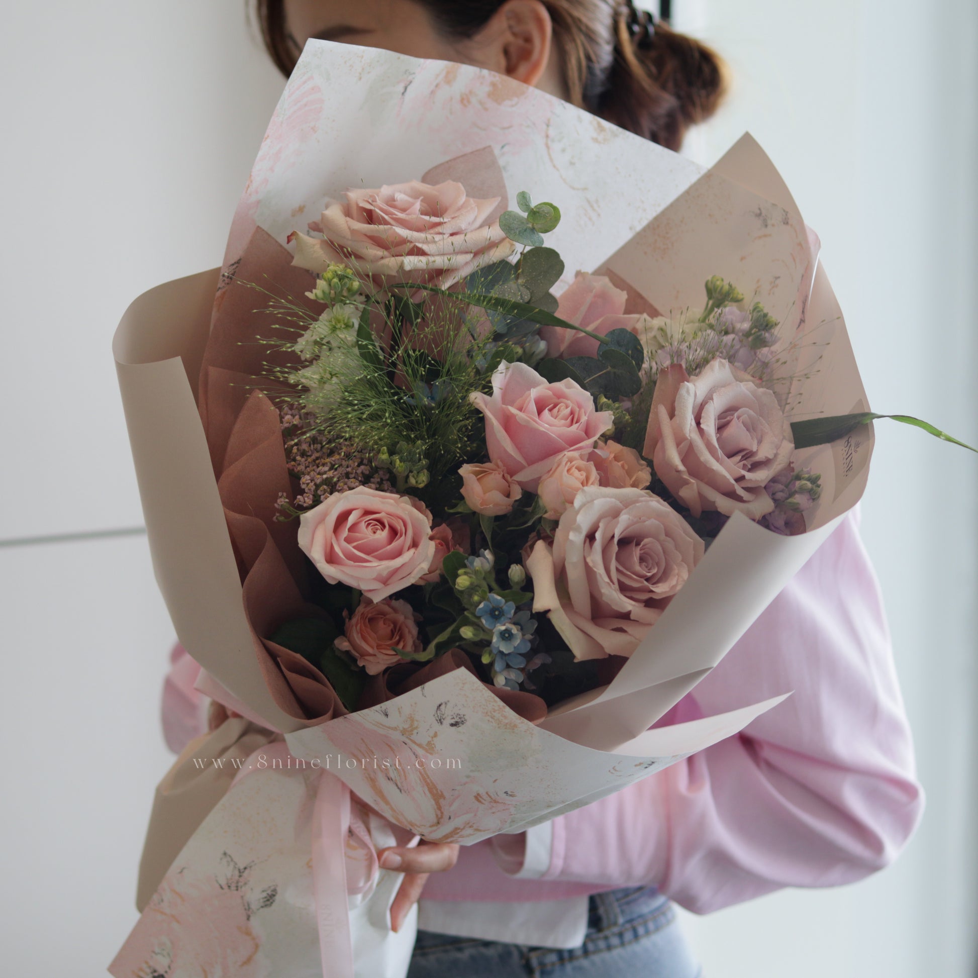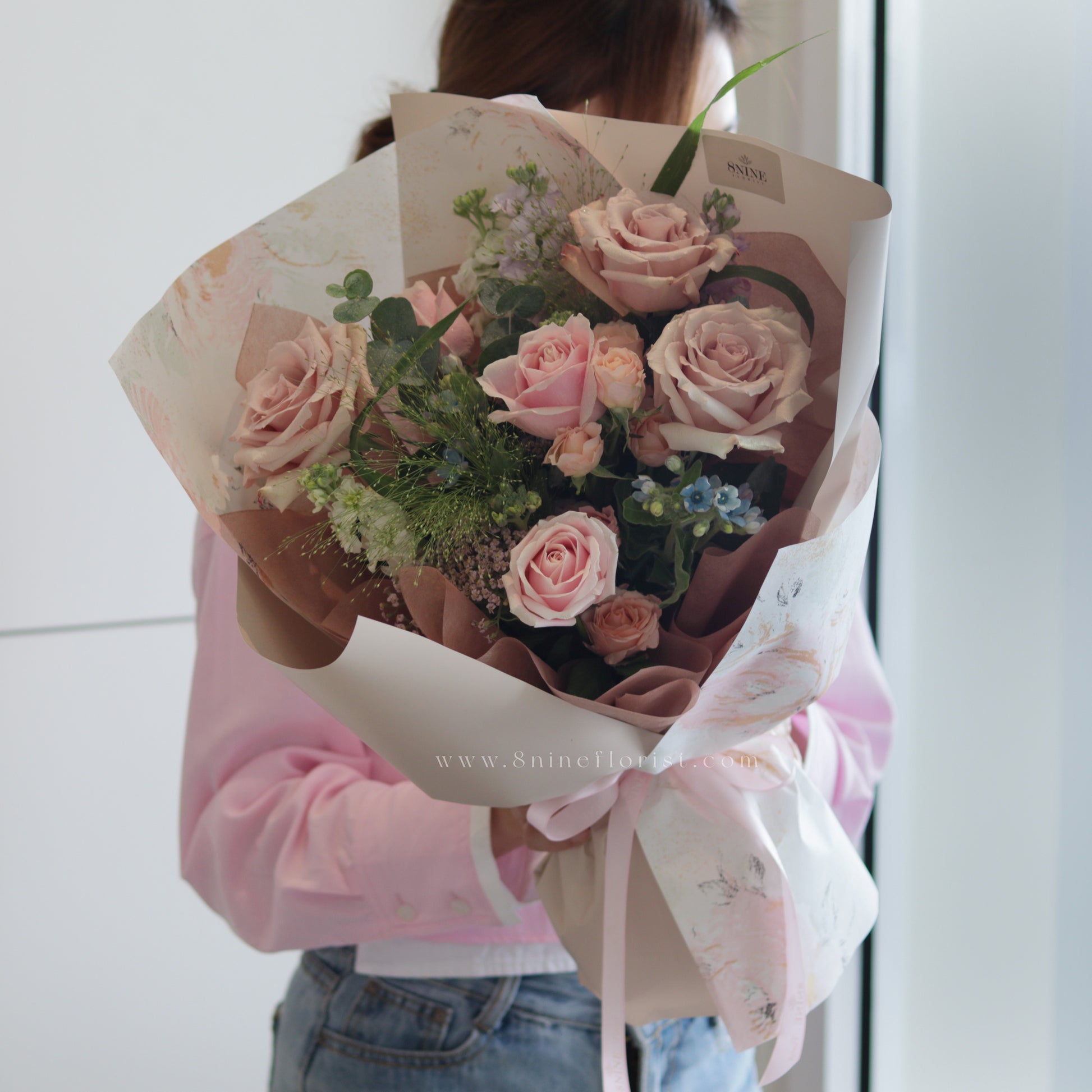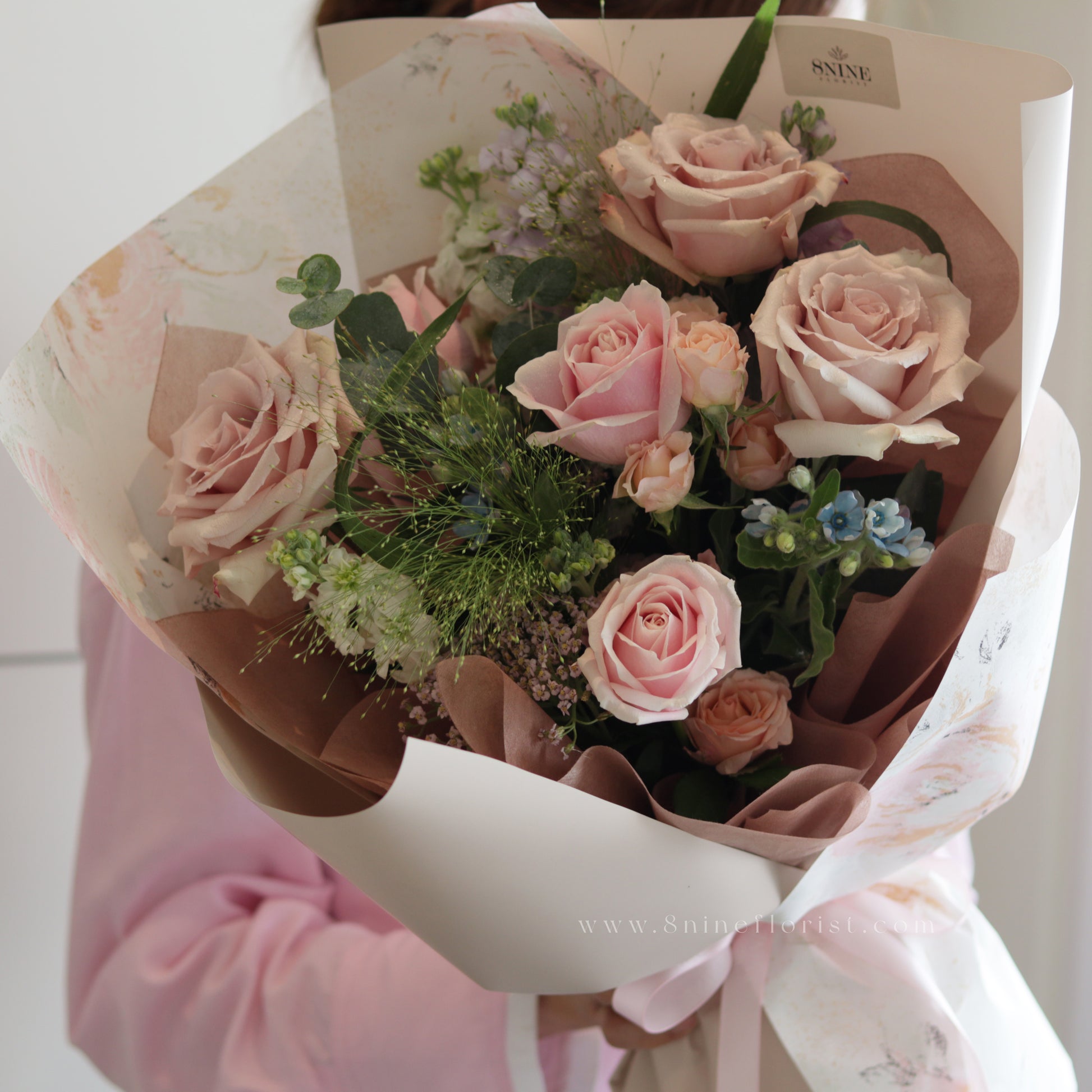 - This mixed flowers bouquet features Pink Roses, Cappuccino Roses, SprayRoses, Blue Star, Mathiola, Panicum, Achillea and with a touch of Eucalyptus Leaves.