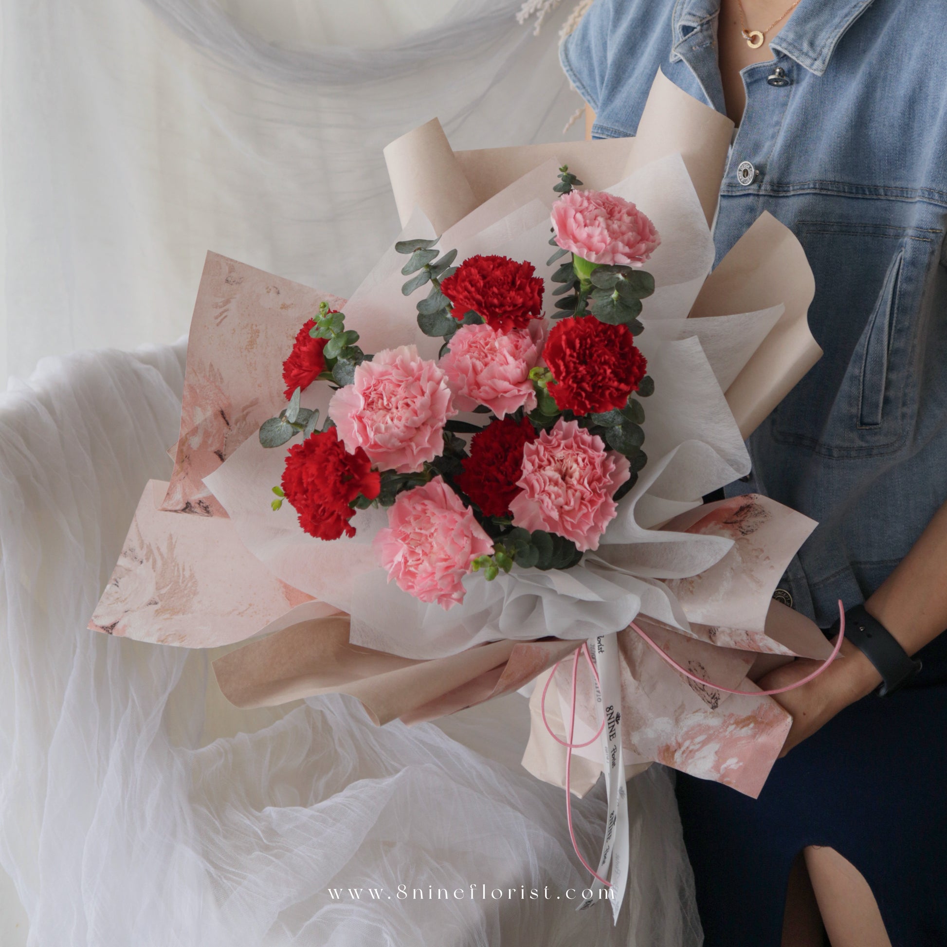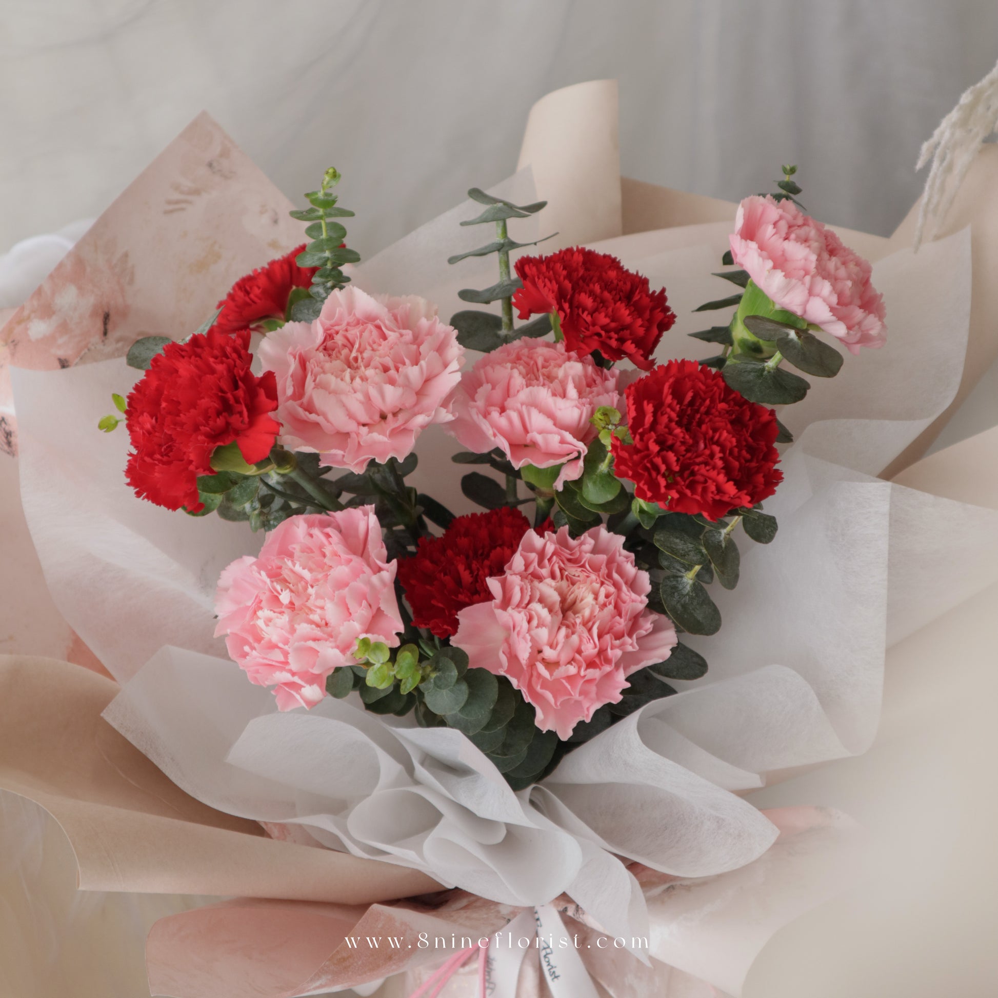 - This flowers bouquet features Pink Carnations, Red Carnations, and Eucalyptus.