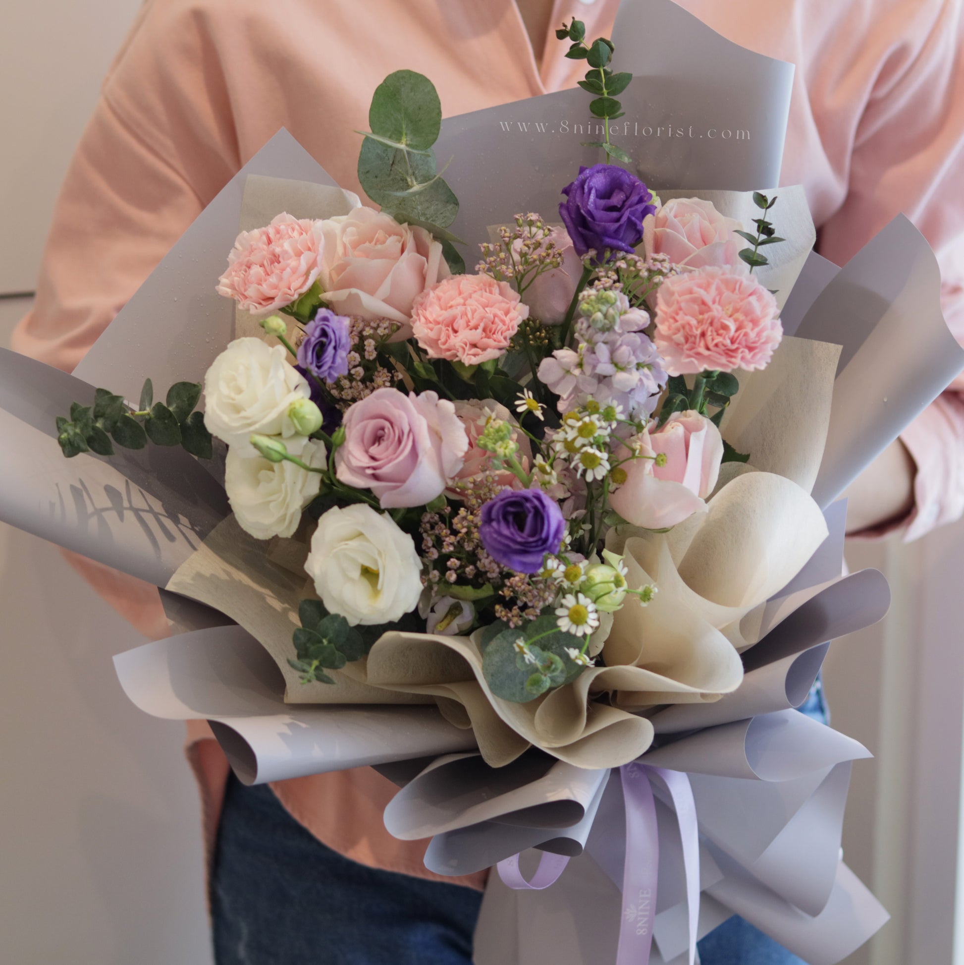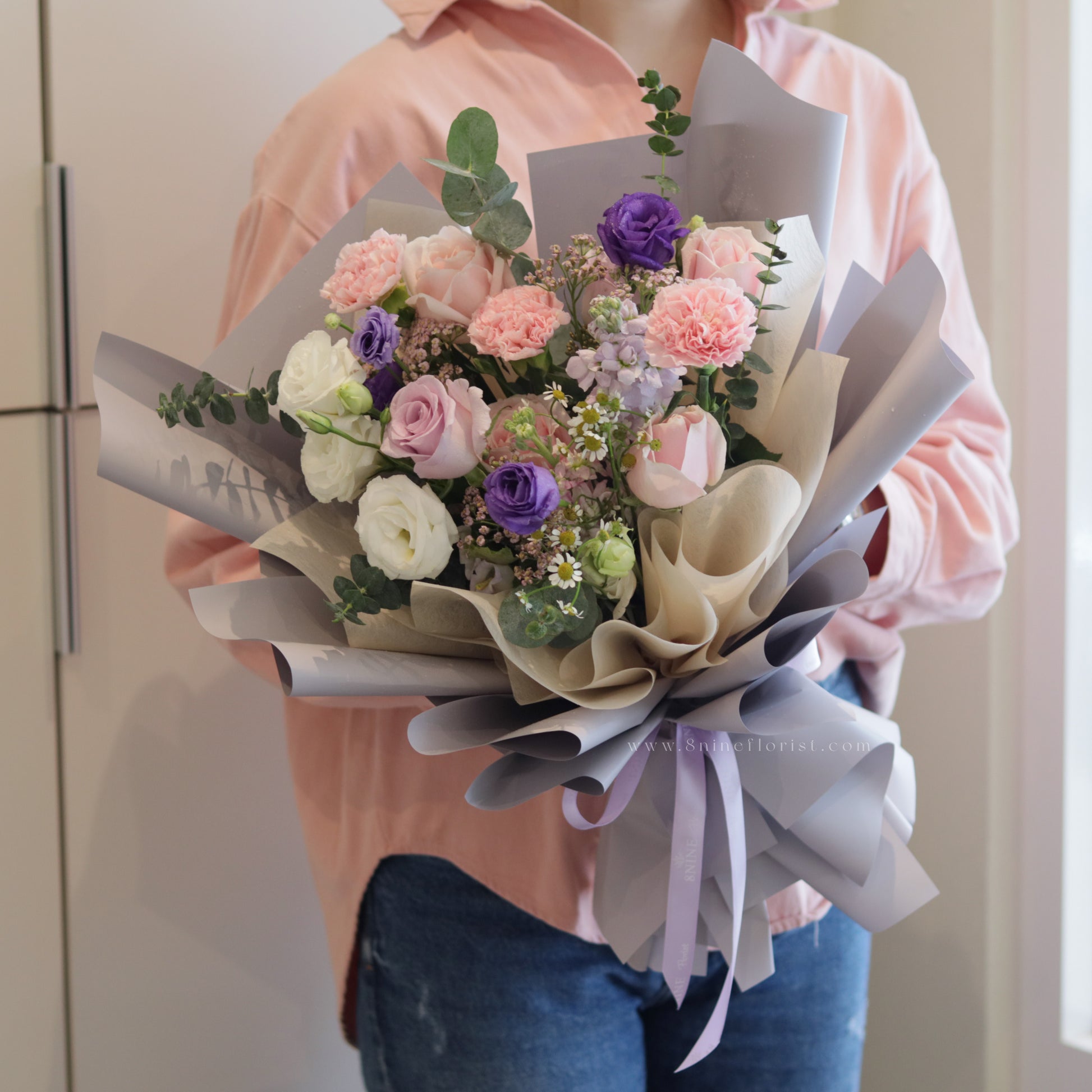 - This mixed flowers bouquet features Pink Roses, Purplr Roses, Carnations, Eustoma, Achillea, Matthiola, Chamomile, Baby Blue with a touch of Eucalyptus Leaves.
