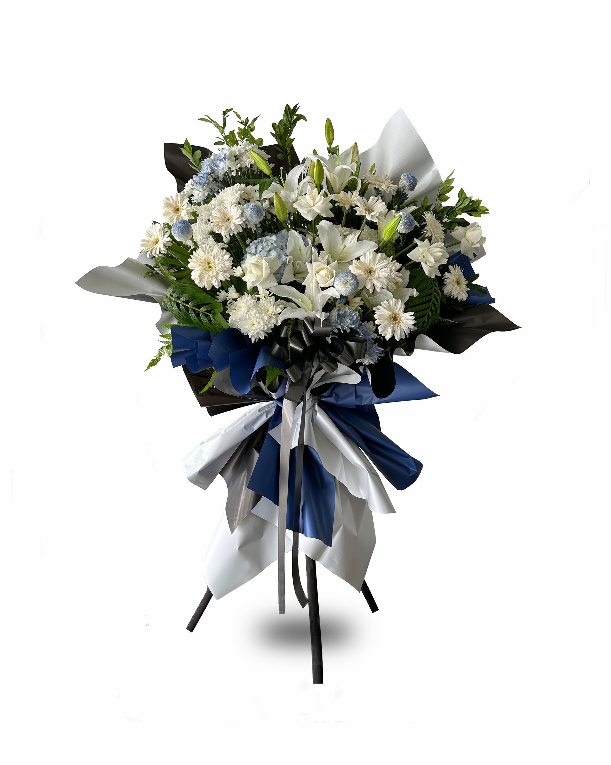 - This Condolences Stands features Blue Hydrangea, Lilies, Roses, Gerbera, Chrysanthemum Ping Pong, Chrysanthemum Pom Pom, with a touch of Jasmine leaves, Palm leaves, and Paku leaves .