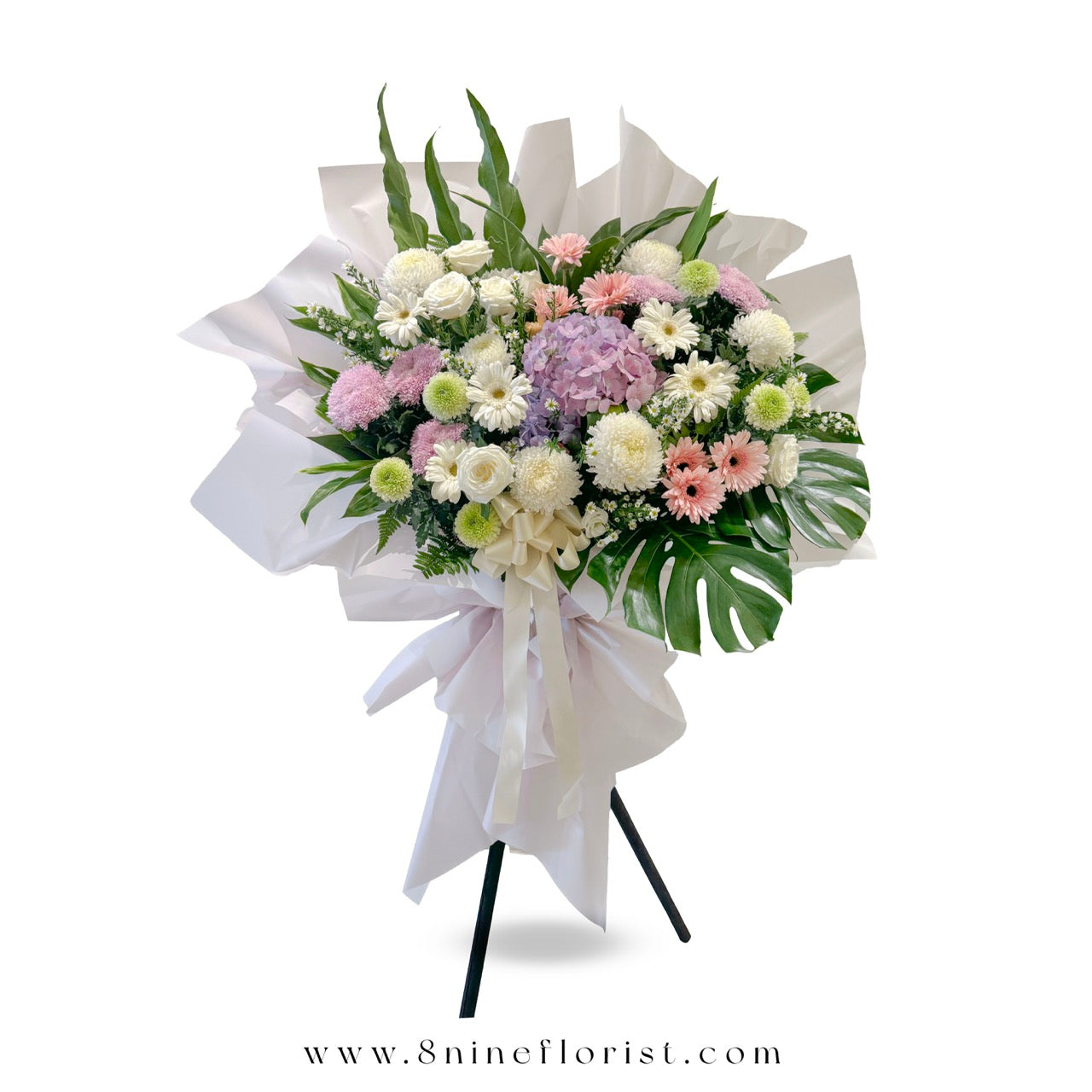 - This single tier Condolences Stands features Purple Hydrangea, White Roses, Chrysanthemums Ping Pong, Chrysanthemums Taiwan Mum, Pink Gerberas, Peacock, Snow White, Monstera, Iron Leaves and Paku leaves.