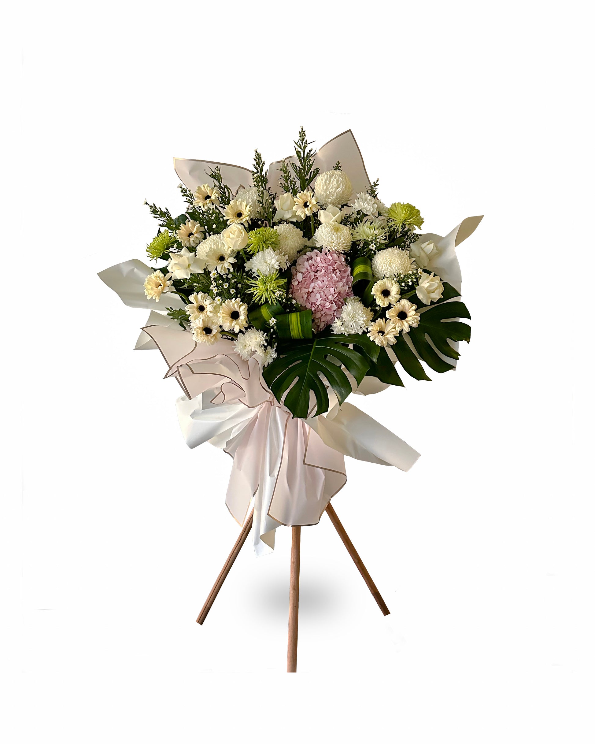 - This Condolences Stands features Pink Hydrangea, Chrysanthemums Taiwan Mum, Anastasia, White Gerbera, White Roses, with a touch of Snow White leaves, Iron leaves, Monstera leaves & Peacocks.