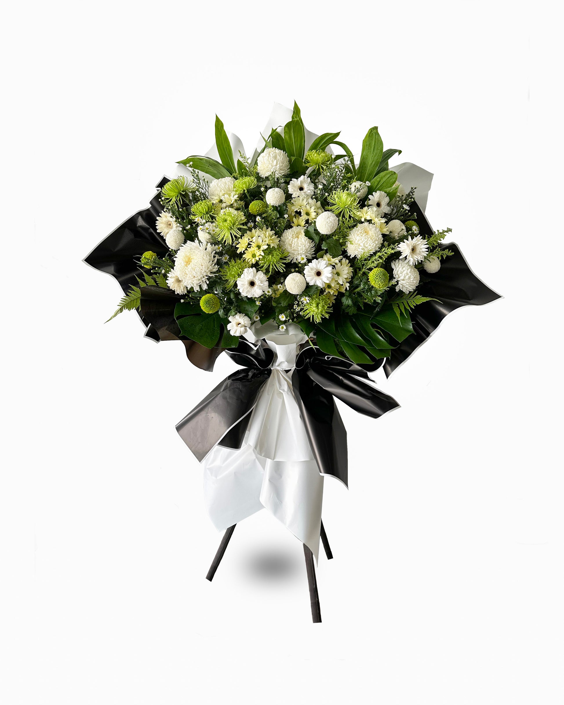 - This Condolences Stands features Chrysanthemum Taiwan Mum, Chrysanthemum Ping Pong, Chrysanthemum Anastasia, Chrysanthemum Pom Pom, Gerbera, with a touch of Snow White leaves, Monstera, Peacocks, and Paku leaves.
