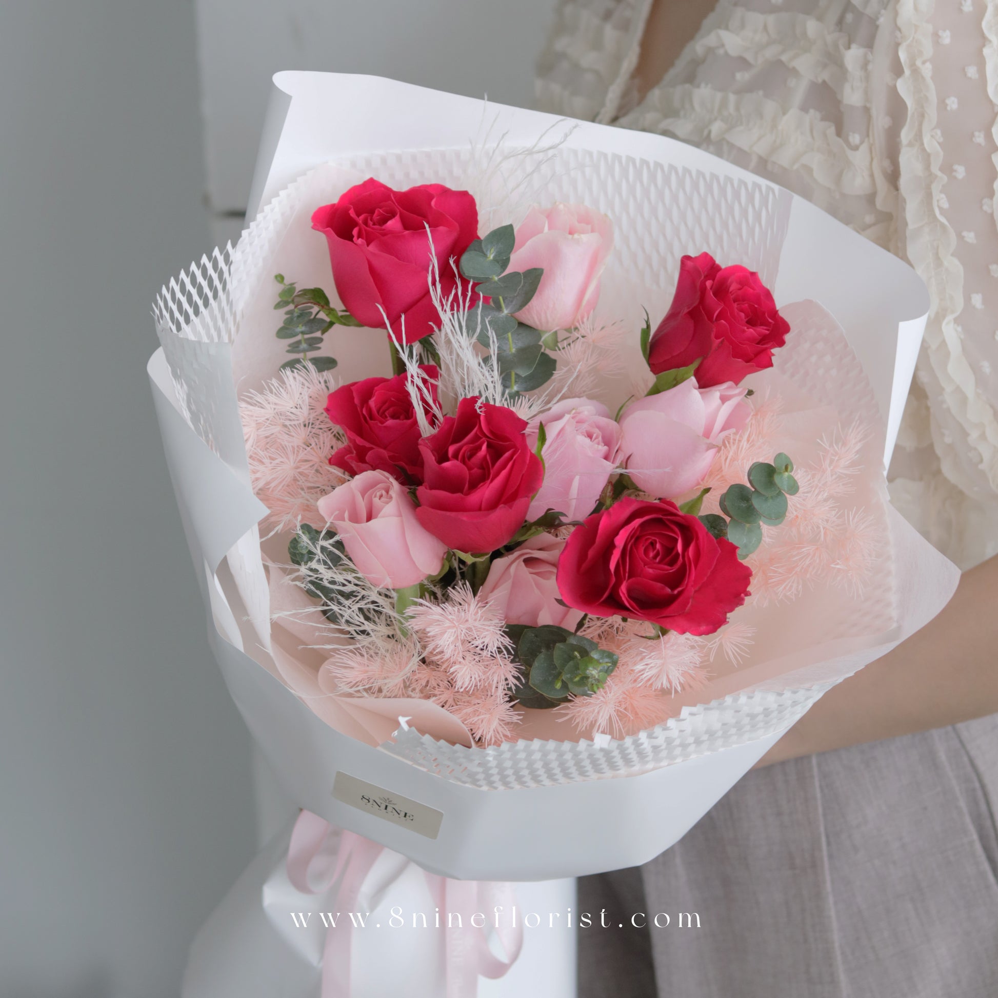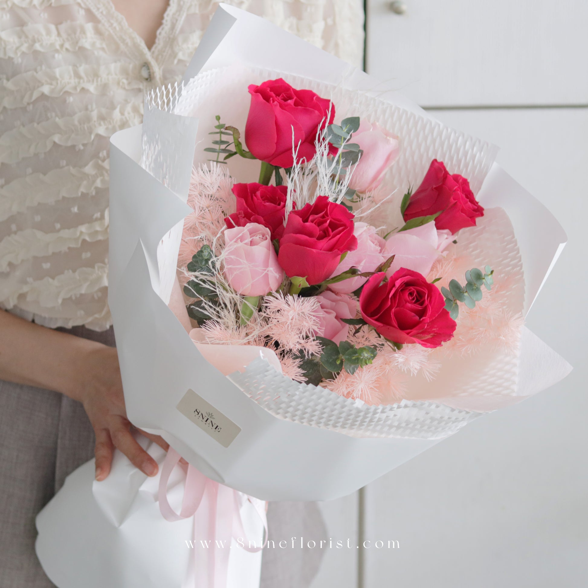 - This flower bouquet features 10 stalks of roses (Avalanche Pink & Hot Pink), preserved flower fillers, and Eucalyptus leaves.