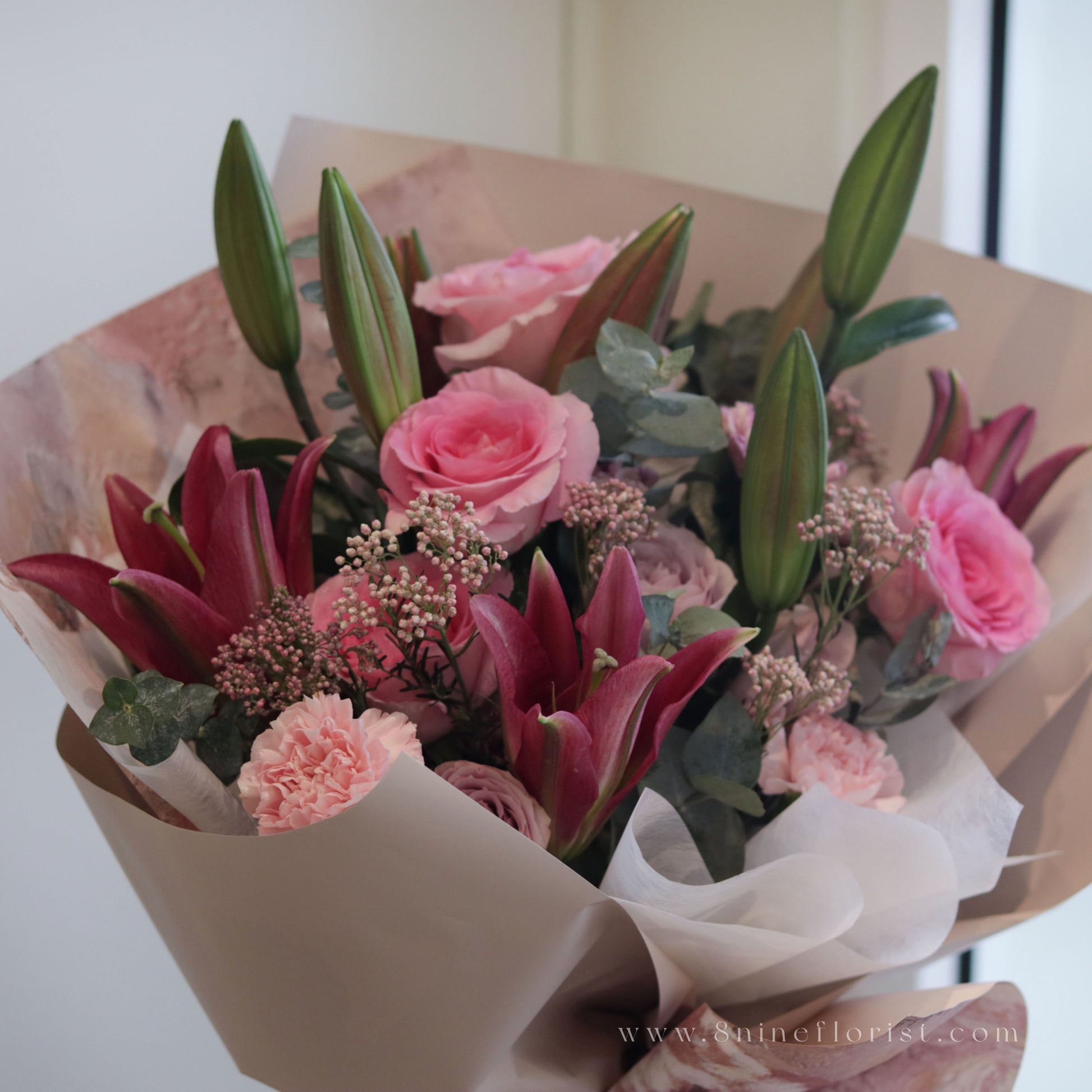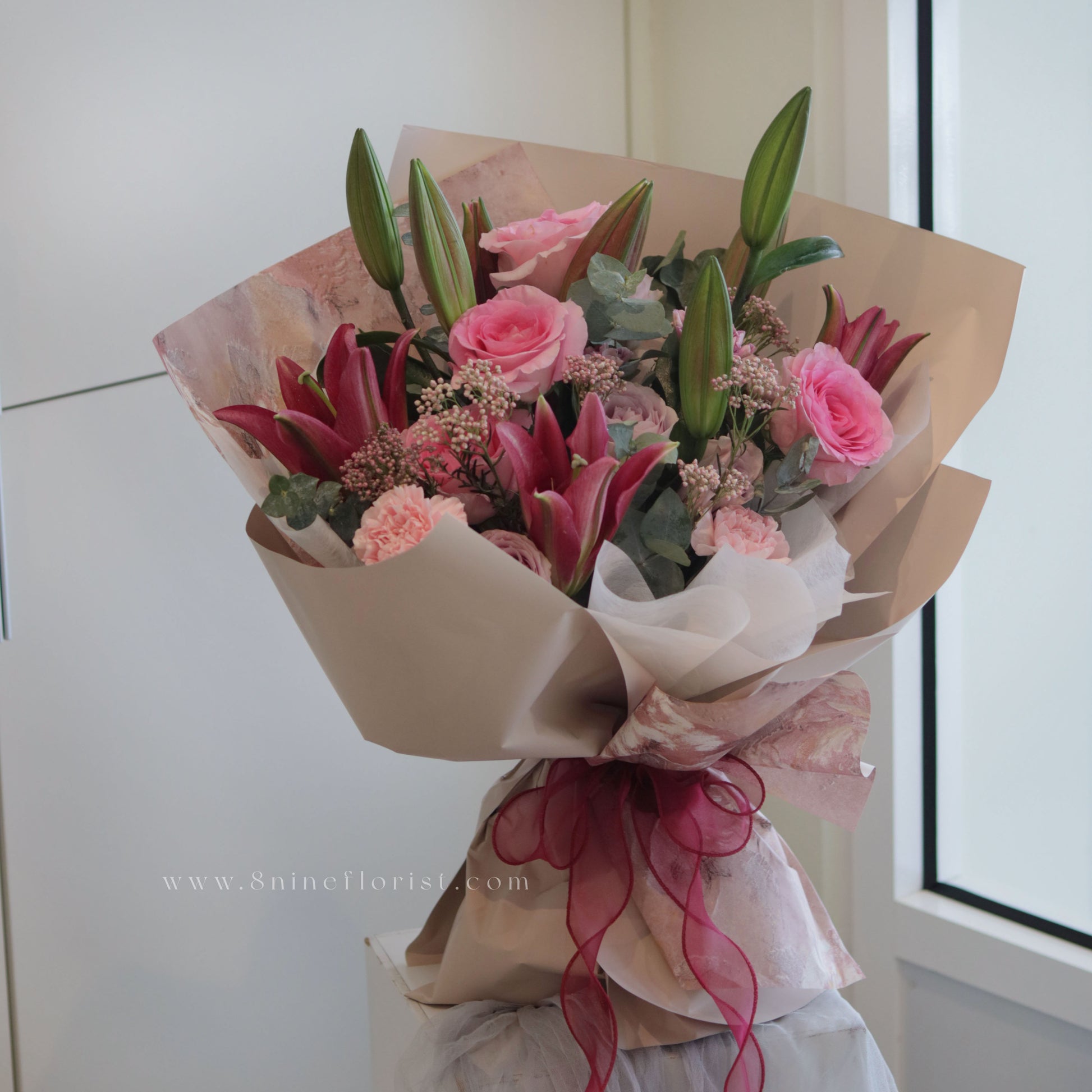 - This flowers bouquet features Lily, Pink Roses, Purple Roses, Carnation, Rice Flower with a touch of Eucalyptus Leaves.