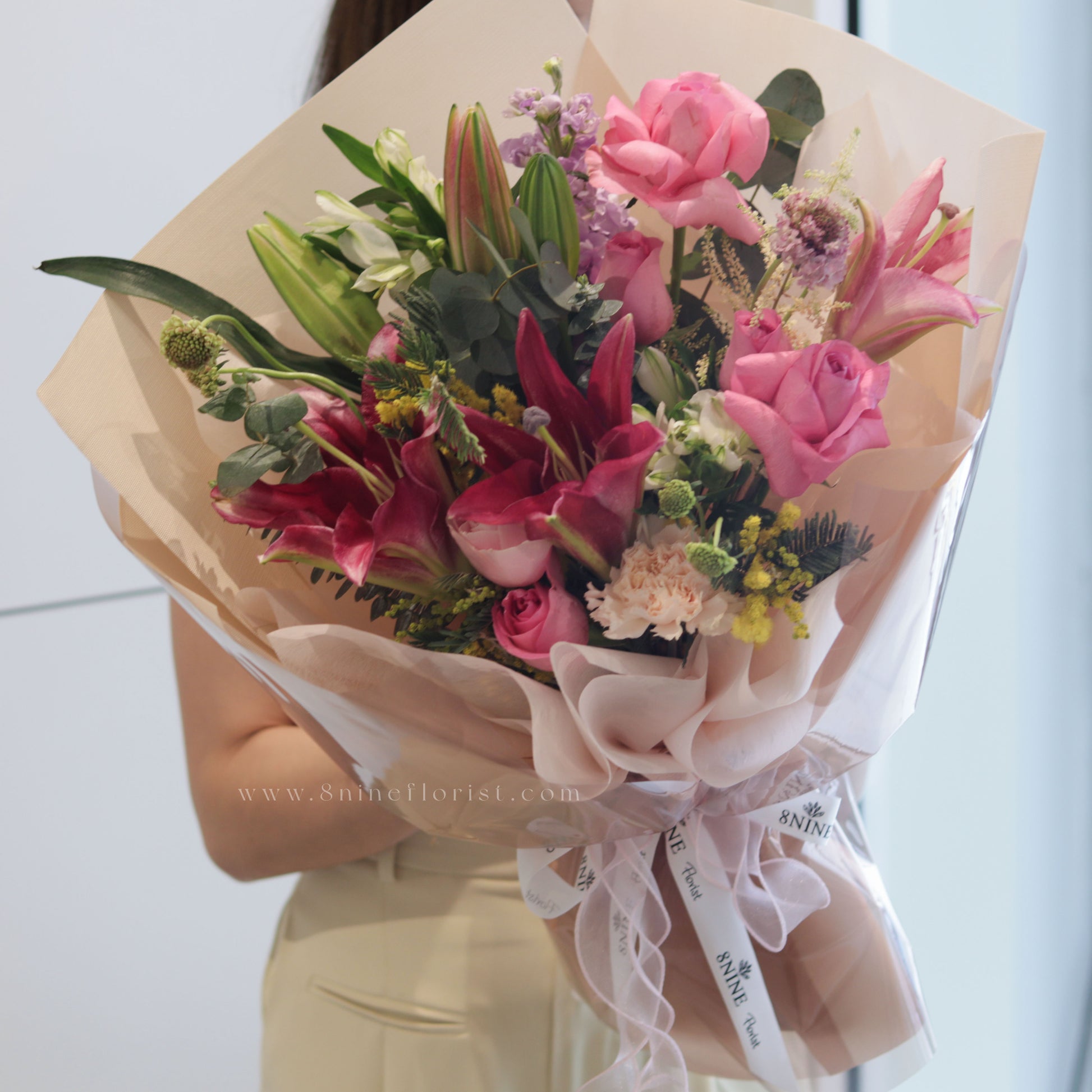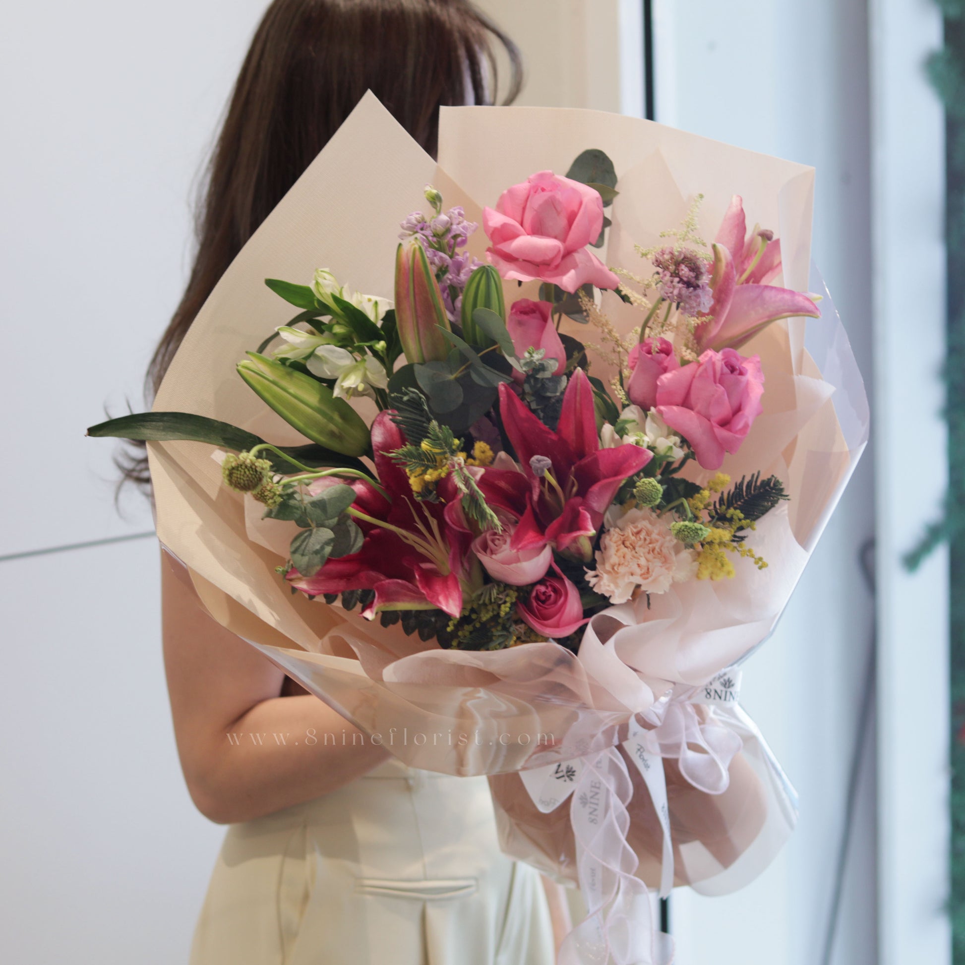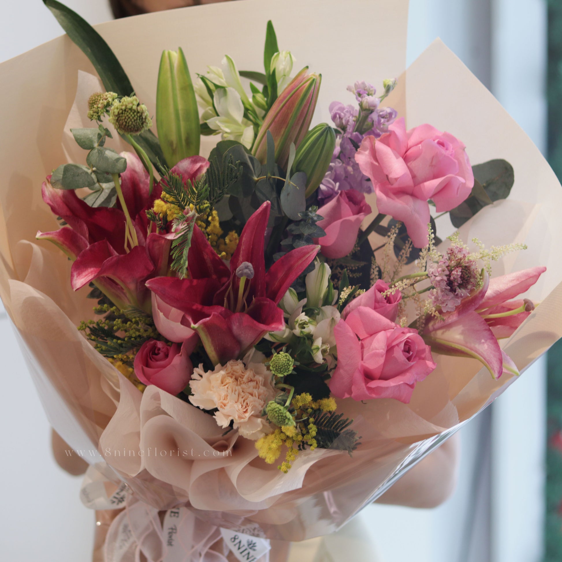 - This flowers bouquet features Columbia Carnations, Lilies, Roses, Carnations, Alstroemeria, Matthiola, Astilbe, Scabiosa with a touch of Eucalyptus leaves.