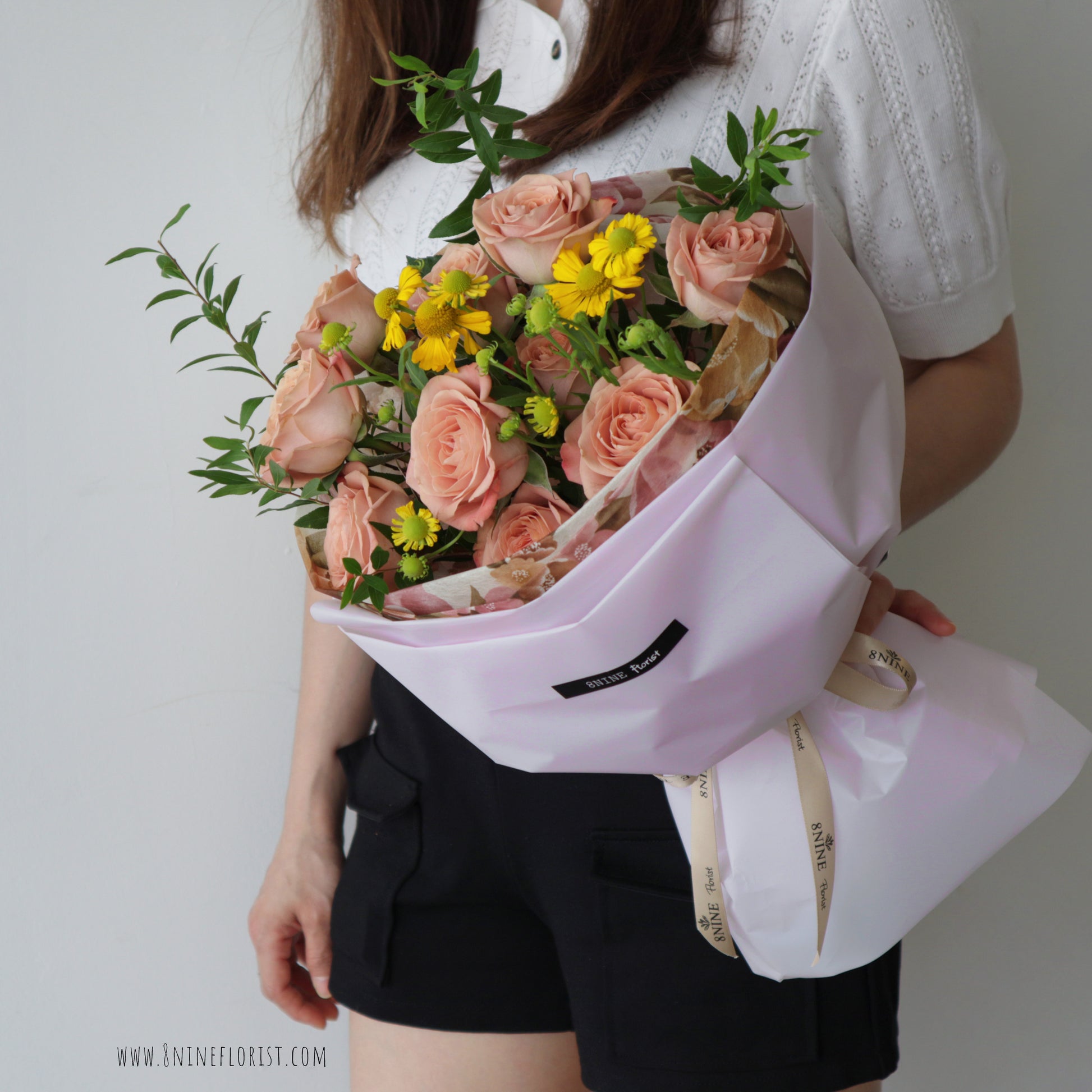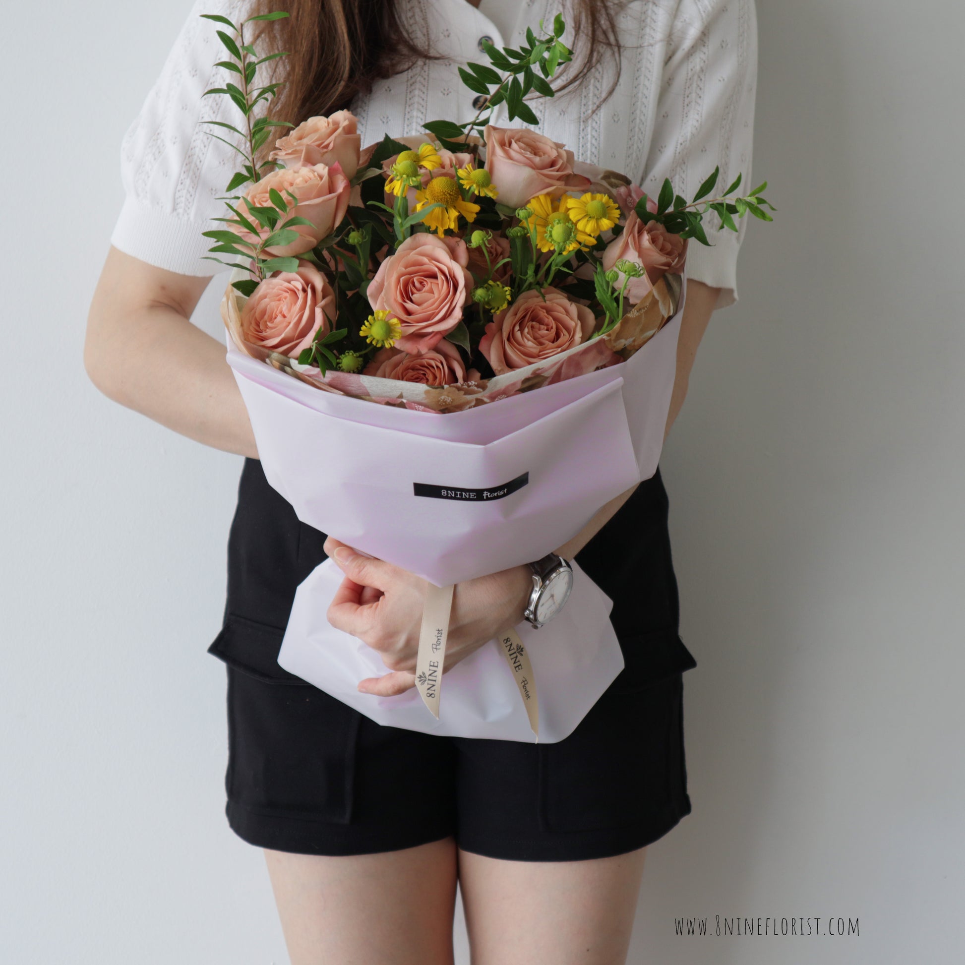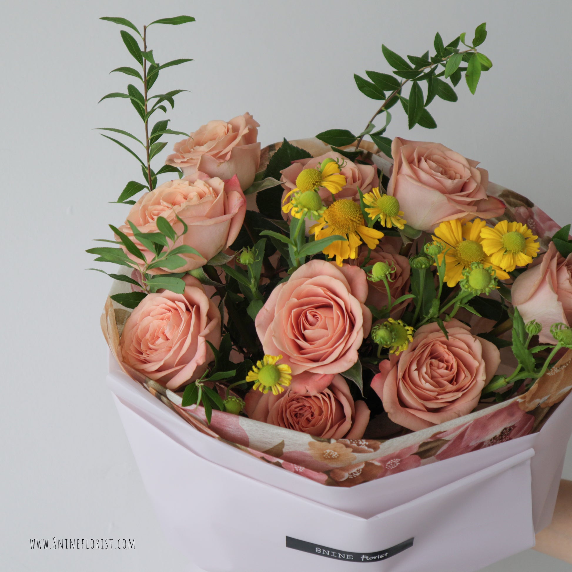 - This Russian Style flower bouquet features Premium Cappuccino Roses, Scabiosa, Eucalyptus Parvifolia.